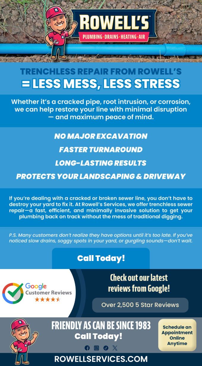 If you're dealing with a cracked or broken sewer line, you don't have to destroy your yard to fix it. At Rowell's Services, we offer trenchless sewer repair—a fast, efficient, and minimally invasive solution to get your plumbing back on track without the mess of traditional digging.