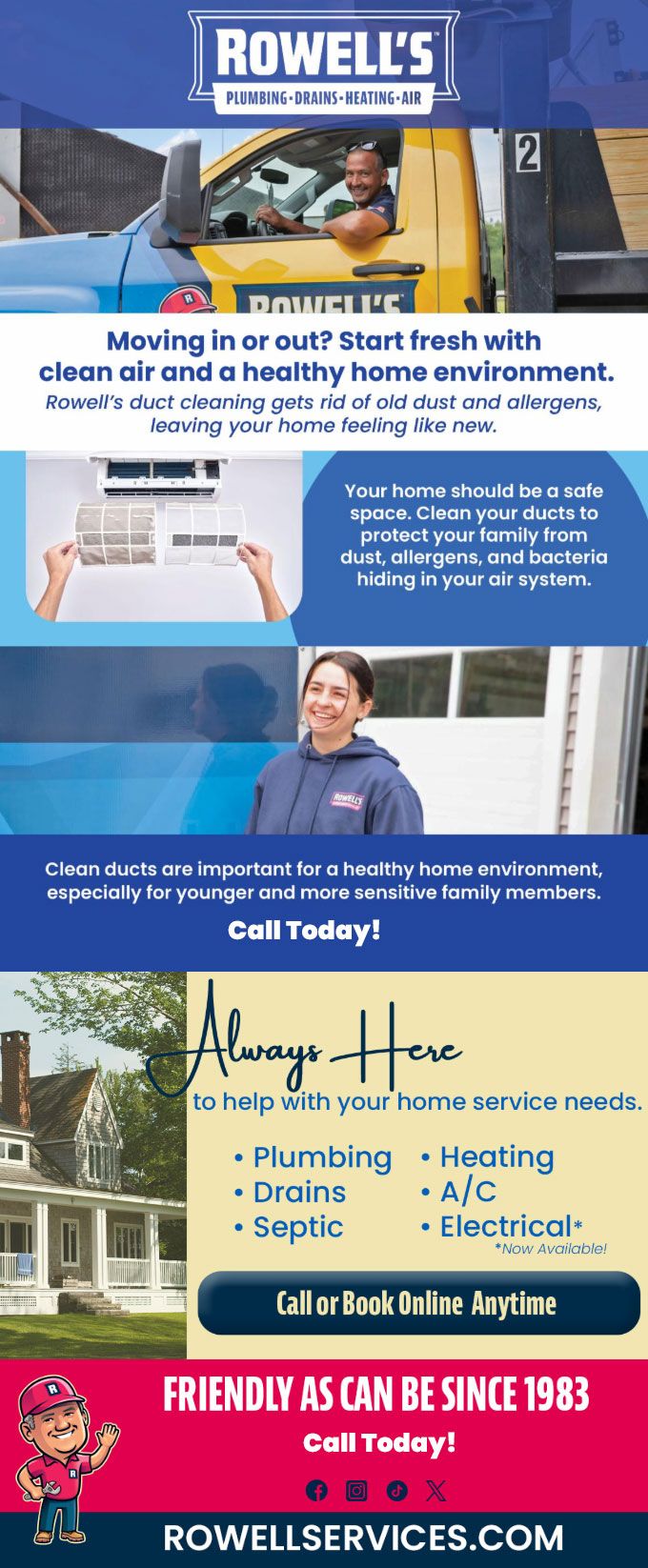 "Friendly As Can Be Since 1983!" When you need help with your plumbing, drains, heating, cooling or electrical in Hebron, you can always rely on Rowell's Services! Call us now or book online!